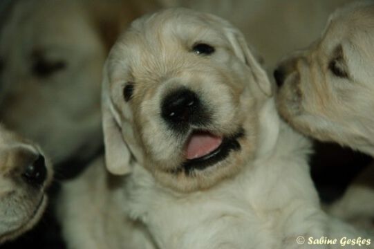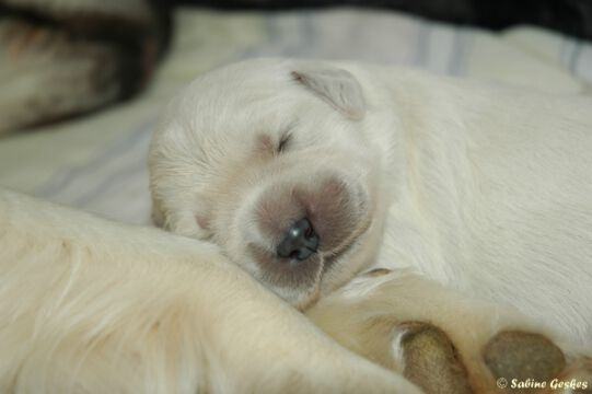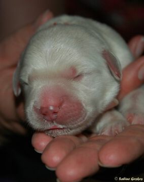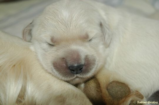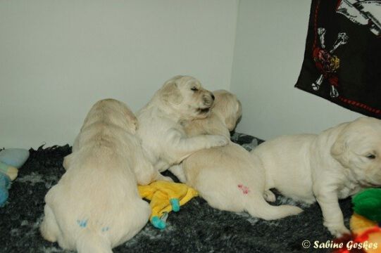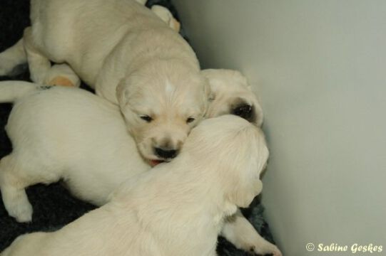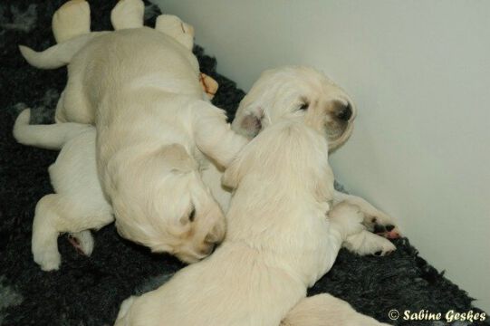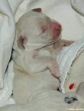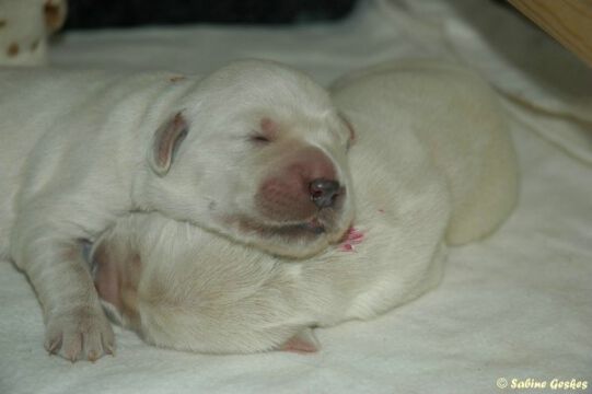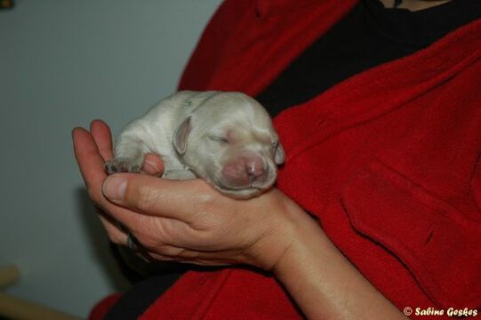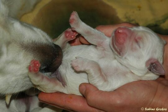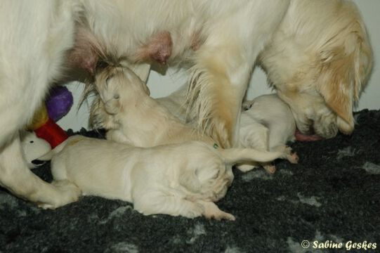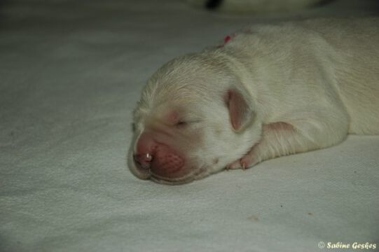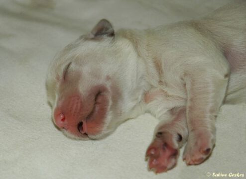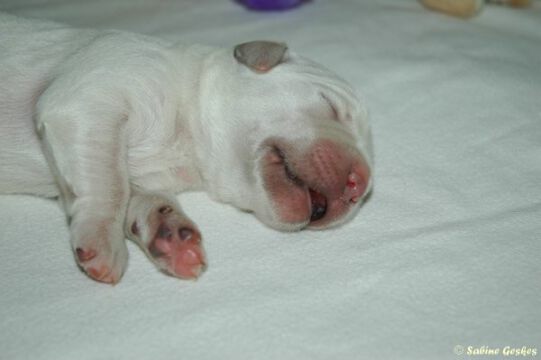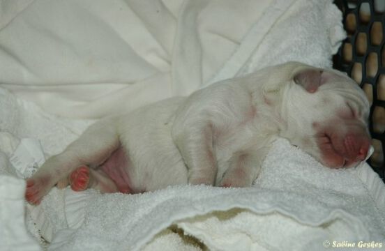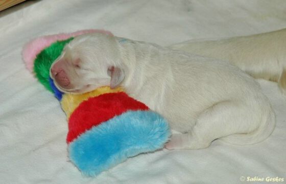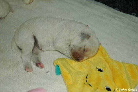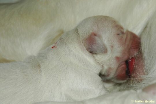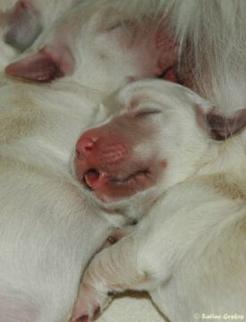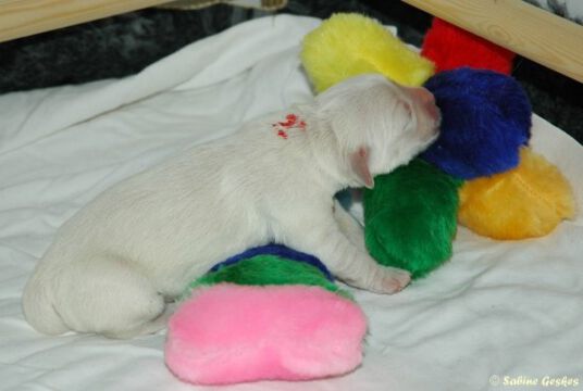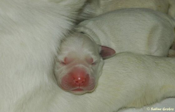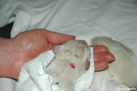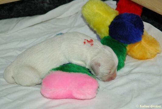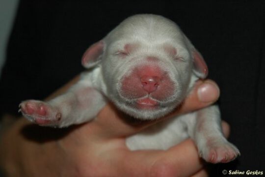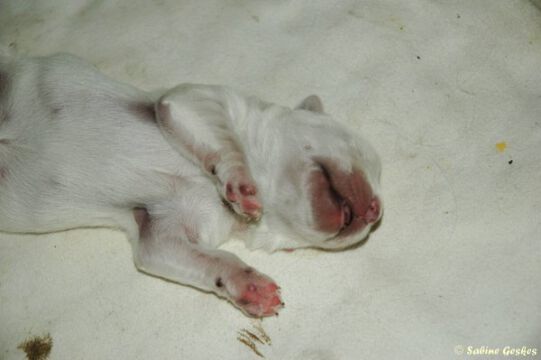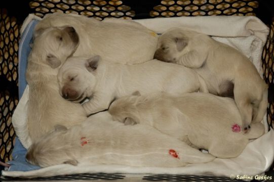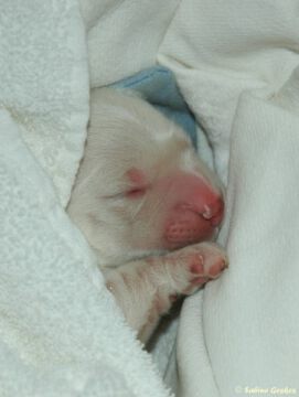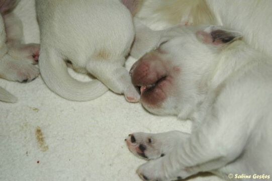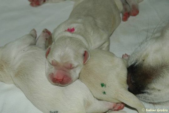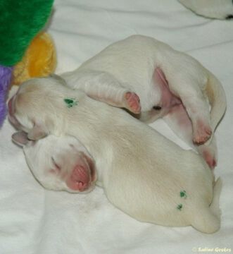 Heute, am 30.04.2010, sind unsere Kleinen schon fast eine Woche alt und sie wachsen und gedeihen ganz prächtig. Alle nehmen ordentlich an Gewicht zu und selbst unser kleiner grüner Frosch ist ein propperes Mädchen geworden und hat als Erste ihr Geburtsgewicht verdoppelt. Es ist eine wahnsinnige Freude, ihnen in der Wurfkiste zuzuschauen und ihre Fortschritte zu beobachten.